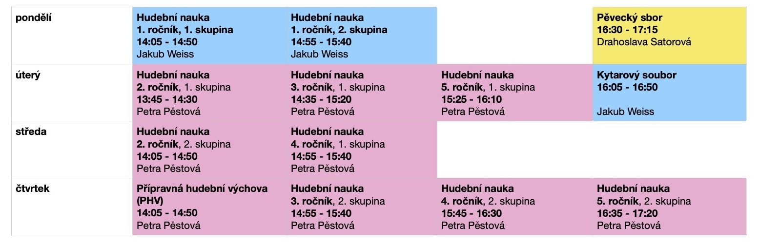 6 leté děti (přípravná hudební výchova) a žáci 1. - 5. ročníku (hudební nauka) si musí nejdřív domluvit hodinu hudební nauky (J. Weiss, P. Pěstová) a PHV (P. Pěstová), viz tabulka níže. (Výuka těchto předmětů začíná druhý školní týden.)